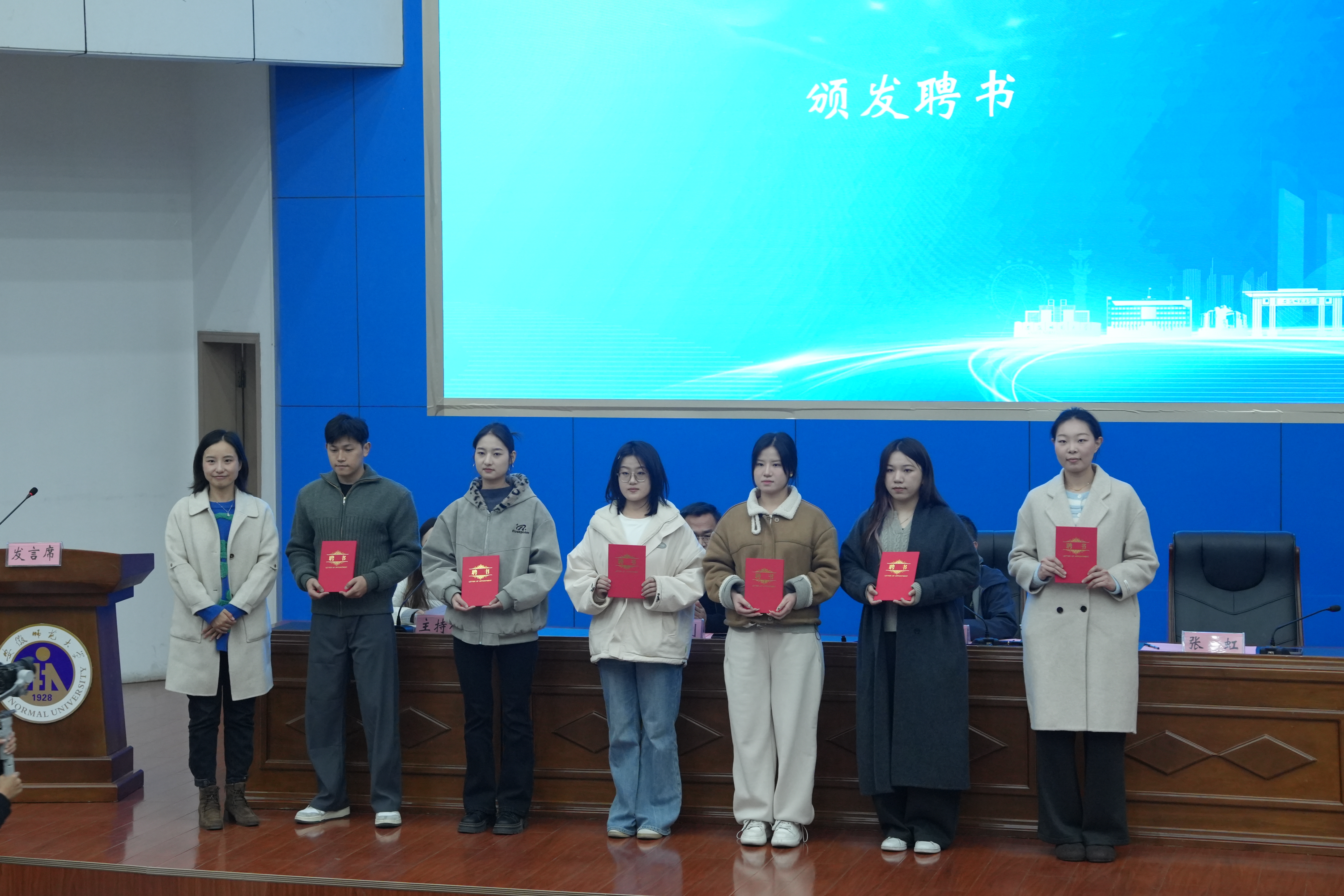 第二十九届校研究生会主席团成员洪宸玥从筑基、搭桥、赋能、增效四个方面围绕思想引领、急难愁盼、品牌建设和改革创新回顾了2024-2025学年研究生会的工作,并对下一年的工作进行展望。随后,校团委副书记张虹宣读第三十届校研究生会成员名单并为成员代表颁发聘书,研究生院副院长韩玉刚宣读2025-2026年度各培养单位研究生会指导教师名单并颁发聘书。最后,党委研工部部长、研究生院院长徐彬进行讲话,他指出在学科交叉融合、长周期人才培养的新背景下研究生会迫切需要在“改”上下功夫,从思维方式上、制度机制上实现更新迭代、转型升级,从能力素养上、作风习惯上实现巩固提升、改进提高;迫切需要在“新”上发挥优势,以学校学科振兴行动计划为依托,固化好品牌、凝练好工作、服务好赛事;迫切需要在“拼”上做文章,既要有敢于拼搏的勇气和自信,也要有善于拼搏的智慧和胆识,把困难这个“绊脚石”变成砥砺斗争本领的“磨刀石”,真正做到知难不退、担难不怯、解难不推。
