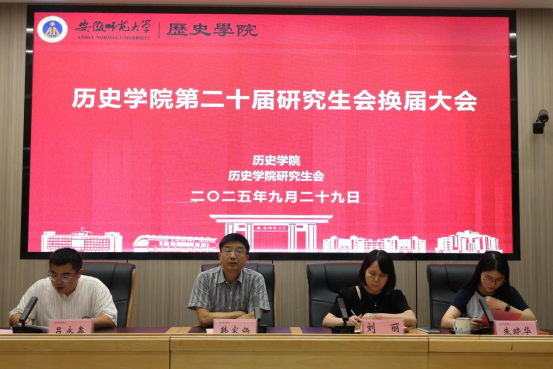 本网讯(历史学院 文/陈蒙 王海靓 图/ 陈湘 蒋静怡)2025年9月29日晚,历史学院第二十届研究生会换届大会在文典楼B108报告厅隆重举行。学院科研副院长韩家炳、科研秘书刘丽、研究生秘书朱晓华、研究生会指导老师吕永鑫,其他学院研会代表、历史学院本科团学代表、研究生班级代表、第十九届研会代表及第二十届研会全体成员参与此次大会。会议由吕永鑫主持。