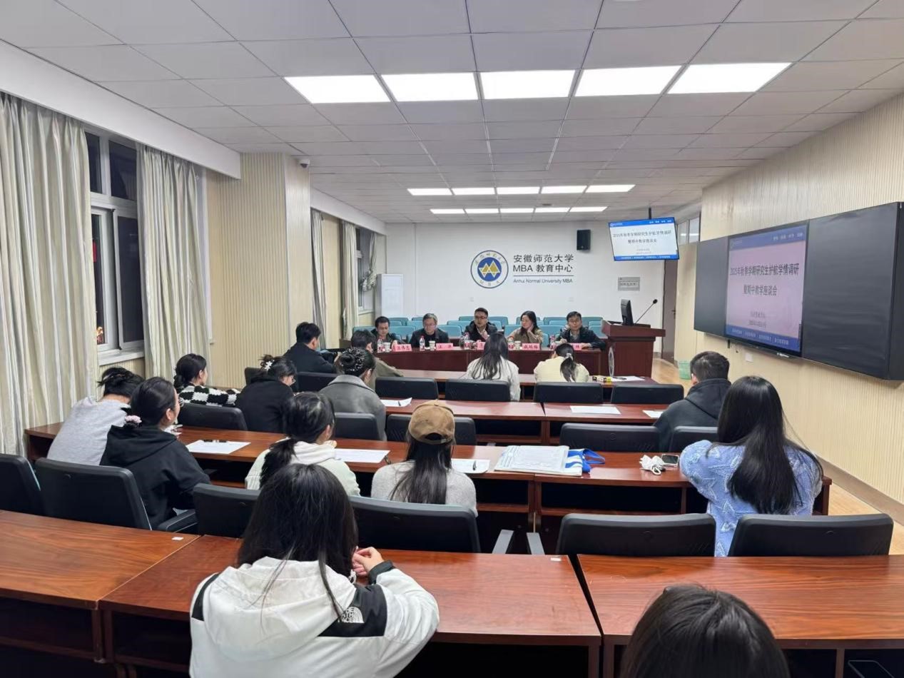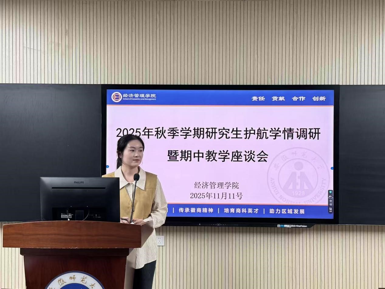 为全面落实大学生护航行动计划,及时准确掌握学生的思想动态和实际诉求,11月11日晚上,经济管理学院在赭山校区物理楼510教室召开2025学年秋季研究生师生护航学情调研暨期中教学座谈会。院长马长伟教授,导师代表汪伟忠、汪洋、钱瑞梅、余吉祥等老师以及各年级研究生代表参加了座谈会,本次座谈会由院研会主席陶琴主持。