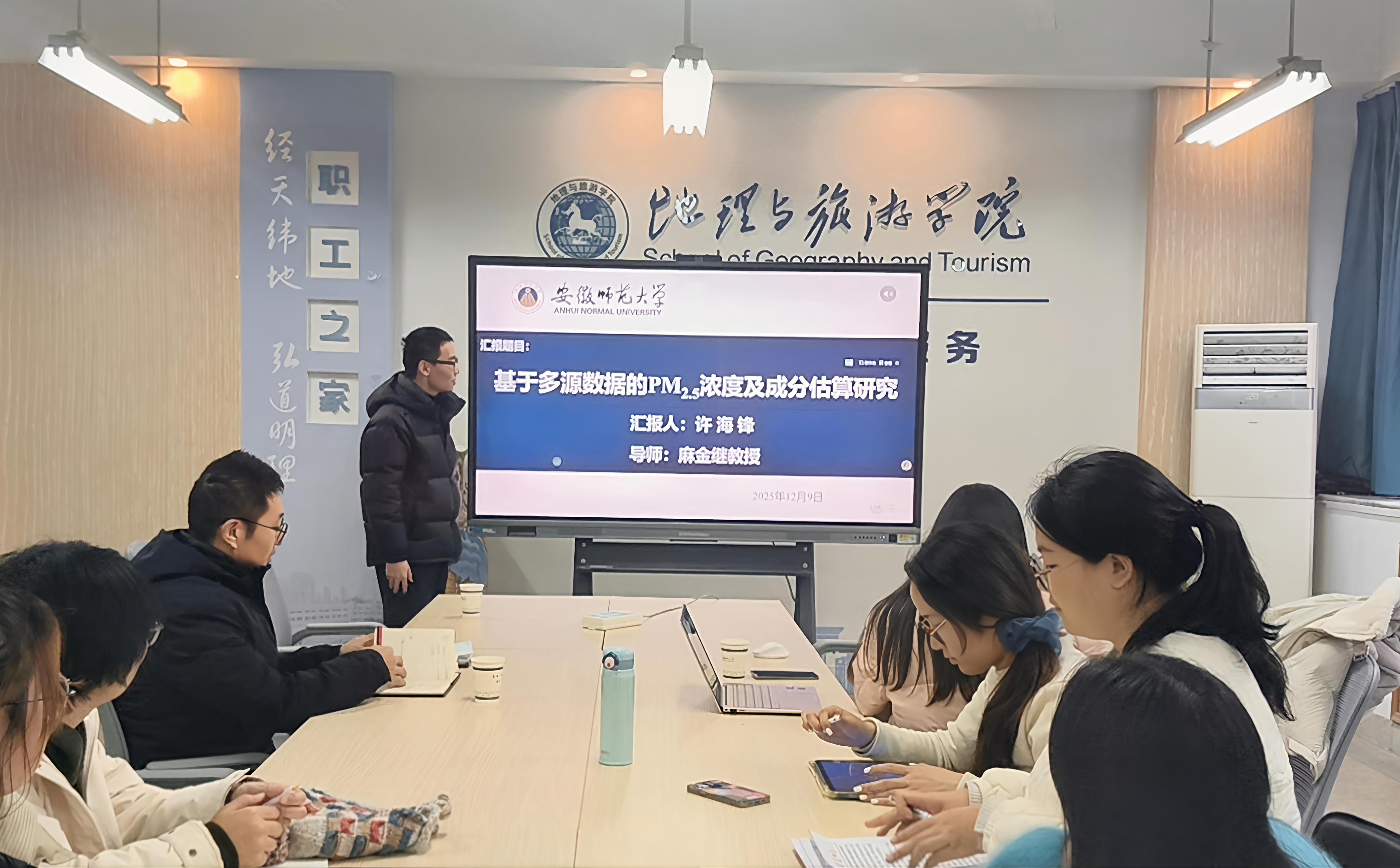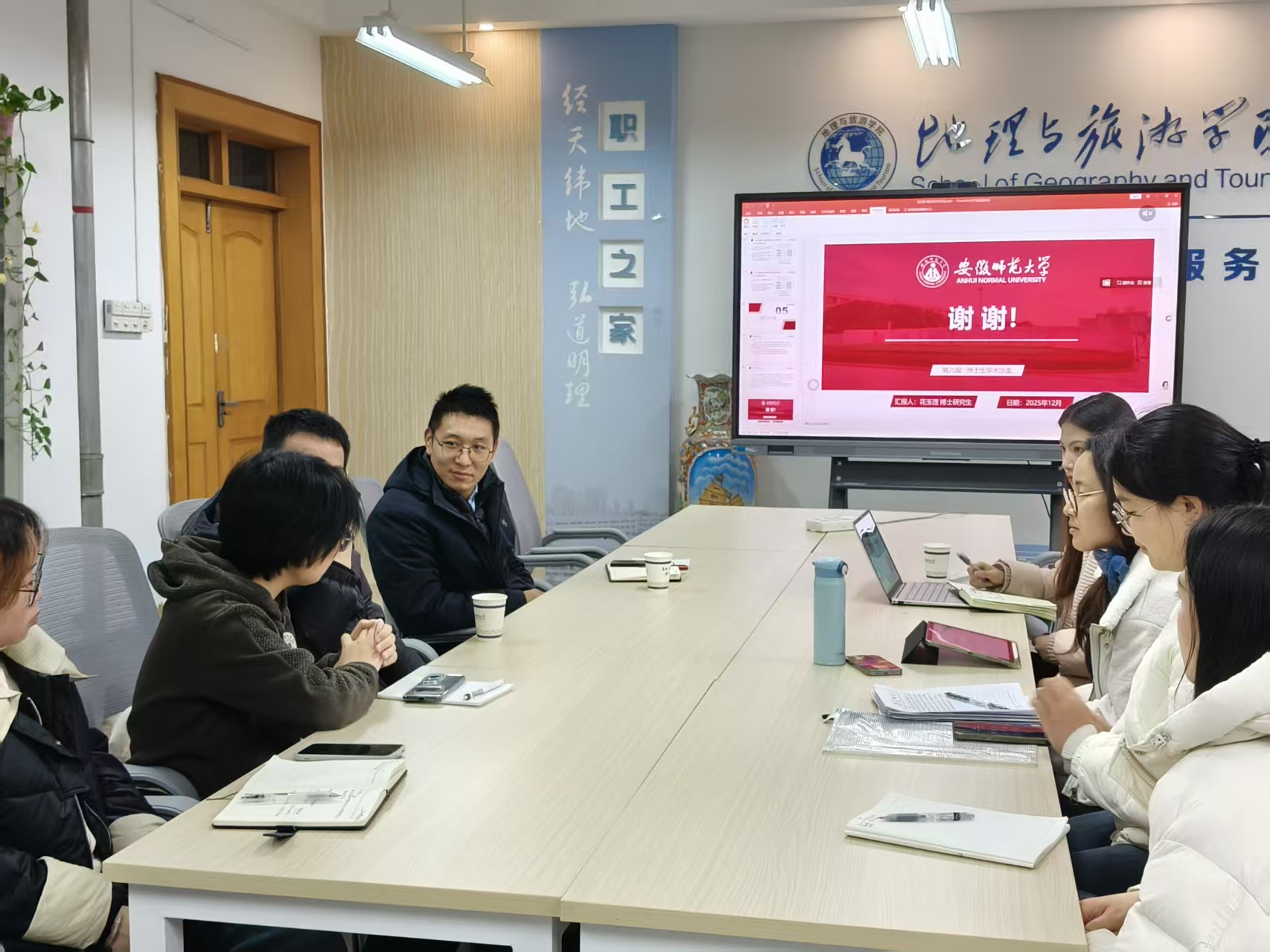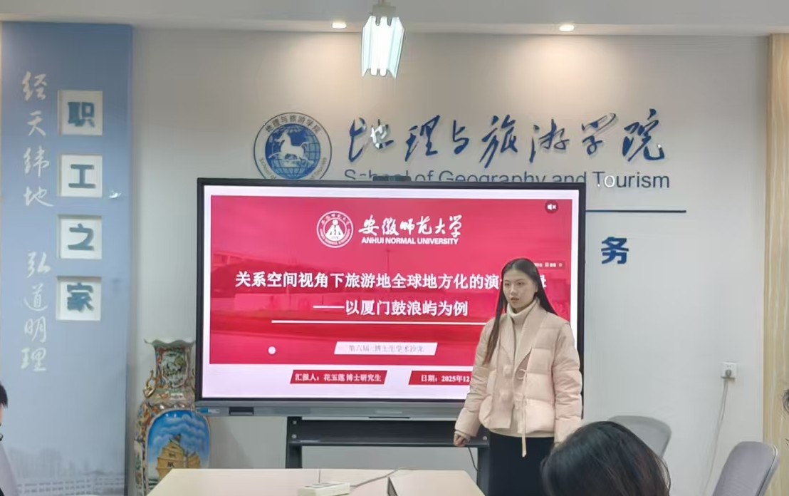 2025年12月24日下午,地理与旅游学院举办了安徽师范大学第六届博士生学术沙龙。活动邀请两位博士研究生许海锋和花玉莲进行学术报告,孙鹏教授及学院研究生参加了此次学术交流活动。