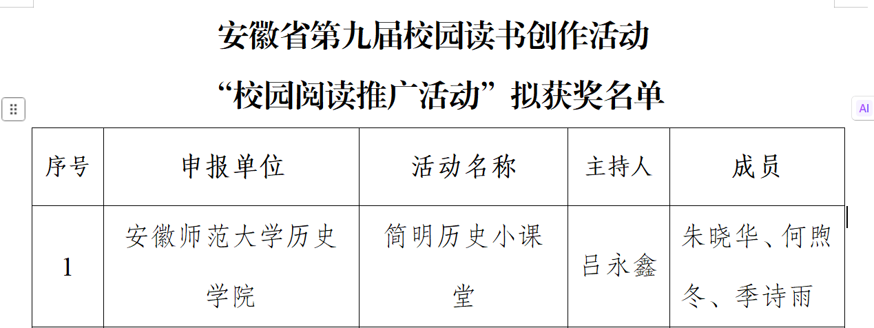 本网讯(历史学院 王海靓)近日,安徽省第九届校园读书创作活动评选结果揭晓,历史学院“简明历史小课堂”凭借鲜明的育人特色、丰富的实践成果与广泛的社会影响,获评“校园阅读推广活动”。