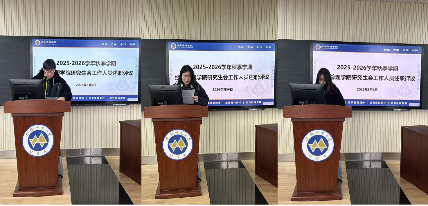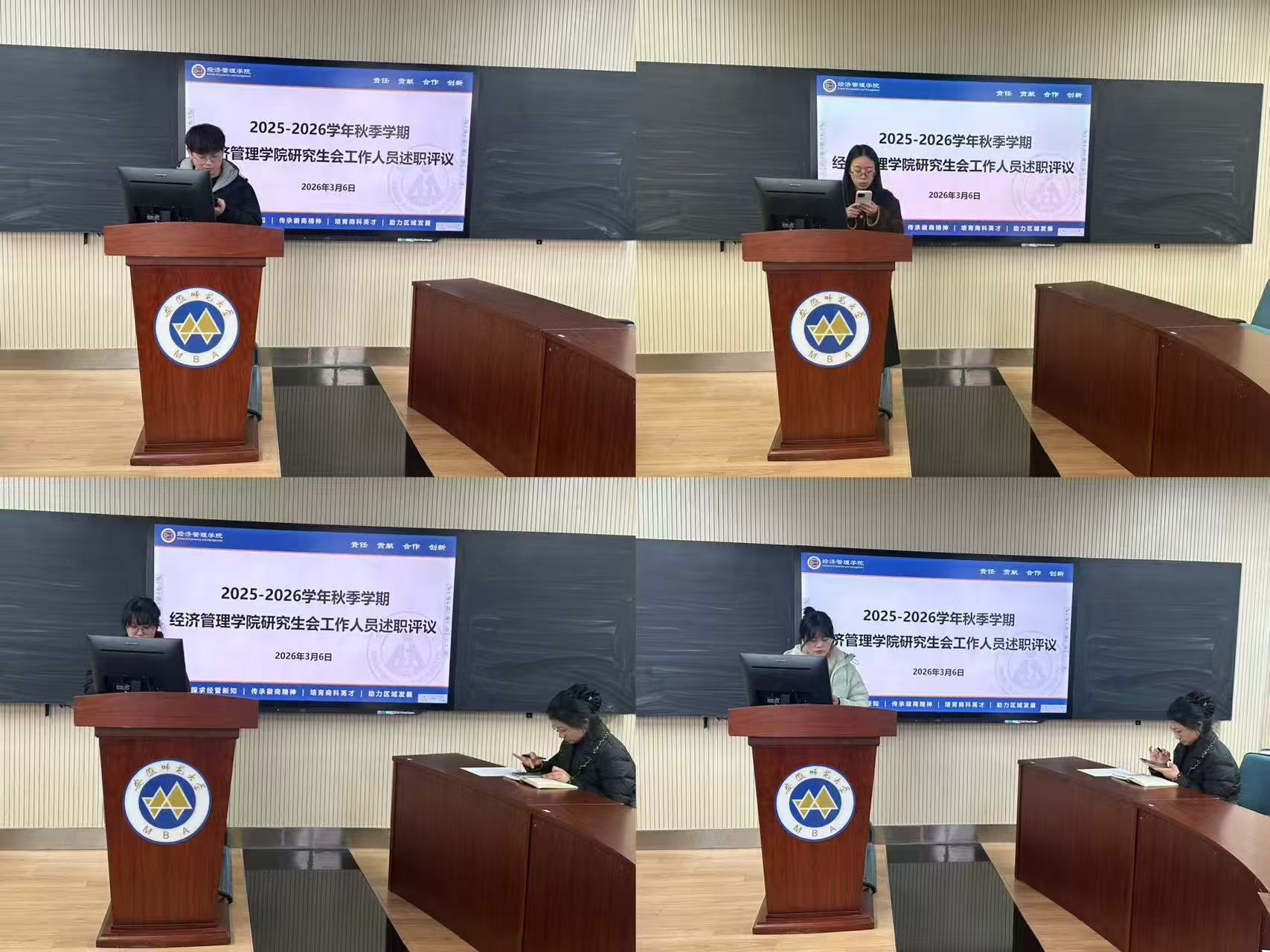 为落实《安徽师范大学学生会改革实施方案》文件要求,总结2025-2026学年第一学期学院研究生会工作、加强研会组织建设,经济管理学院于2026年3月6日下午在赭山校区物理楼MBA教室成功举办“2025-2026学年第一学期研究生会工作人员述职评议汇报会”。本次会议出席人员包括:院研究生会指导老师兼研究生辅导员钟颖老师,校研究生会主席万超,院研究生会主席团成员陶琴、汪乐、陈雨;此外,院研究生会代表、学院各班级班长及学生代表也参会列席。会议由院研究生会主席陈雨主持。