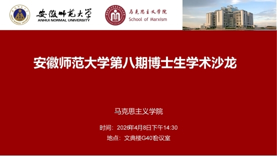 2026年4月8日下午14:30,安徽师范大学马克思主义学院在学院四楼407会议室成功举办第八期博士生学术沙龙活动。马克思主义基本原理博士学位点导师彭启福、戴兆国、汪盛玉、单传友、干成俊、伍旭中教授出席指导。本次活动由学院马克思主义基本原理博士学位点负责人汪盛玉主持,马克思主义基本原理学位点博士生王伟、储锐、刘朵、郑梦如、杨军、王星悦和其他各年级以及其他博士学位点研究生等20余人参加。