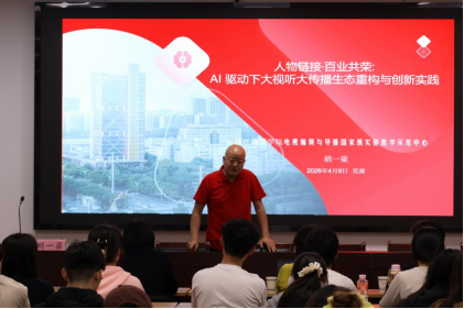 为助力师生把握大视听大传播领域前沿趋势,4月9日晚,安徽师范大学新闻与传播学院于新传院楼405教室,开展“人物链接·百业共荣:AI驱动下大视听大传播生态重构与创新实践”专题讲座,本次讲座特邀浙江传媒学院电视编辑与导播国家级实验教学示范中心副主任、教授级高级工程师胡一梁进行分享,由新传学院执行院长马梅教授主持,学院部分教师、研究生到场交流学习。