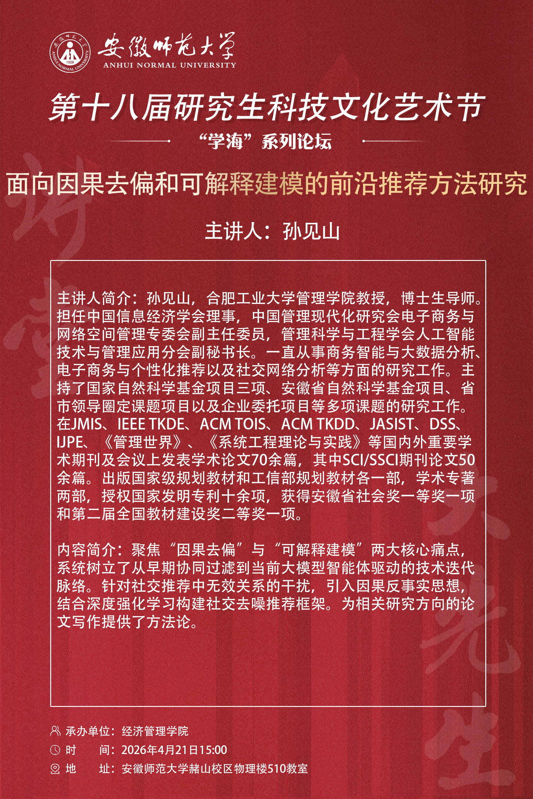 上一条:【第十八届研究生科技文化艺术节】学术活动月“大先生”讲堂四